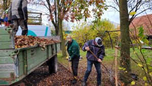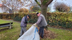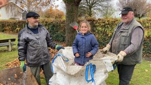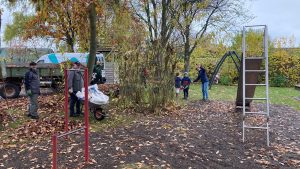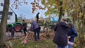 | Herbstlaubaktion Pünktlich zur Herbstlaubaktion von Dorfgemeinschaft, Feuerwehr und Ortsrat am Samstag, 15.11.25 hatten die Bäume noch mal ordentlich Laub abgeworfen. Treffpunkt war mit den nötigen Gerätschaften auf den „Thie“. Seit Anfang Oktober schon war das Laub auf vom Thieplatz und der Fläche vor der St. Anna-Kapelle regelmäßig mit dem Rasentraktor aufgesammelt und um die Baumscheiben gelagert worden. Das reduzierte stark die Masse an Laub und es waren lediglich 2 Gummiwagen, die abgefahren werden mussten. Weitere Einsatzgebiete waren der Spielplatz und die Grünanlagen rund um das Feuerwehrgerätehaus, wo die großen Bäume jedes Jahr für reichlich Arbeit sorgen. Nach getaner Arbeit stärkten sich alle bei Harzwürsten, Kürbisauflauf sowie kalten und warmen Getränke. Ein herzlicher Dank geht raus an alle Helfer, die Traktorfahrer und das Verpflegungsteam. |