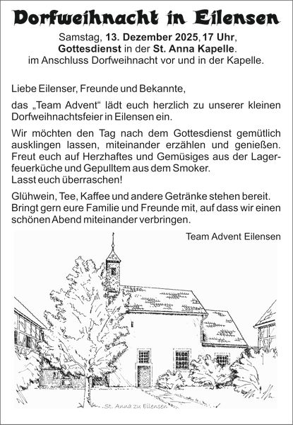 | Der Baum steht und der Brunnen leuchtet ! Auch in diesem Jahr hat das „Weihnachtsbaum-Team“ der Dorfgemeinschaft wieder ganze Arbeit geleistet. Pünktlich zum 1. Advent wurde ein wunderschöner Weihnachtsbaum organisiert, transportiert, aufgestellt und beleuchtet. Außerdem hat Familie Michaelis, wie schon in den vergangenen Jahren, für die stimmungsvolle Beleuchtung des alten Dorfbrunnens gesorgt. Der Vorstand der Dorfgemeinschaft wünscht allen Mitgliedern und Unterstützern eine besinnliche Adventszeit. Die kommenden Termine in der Adventszeit: – Musikalischer Gottesdienst mit Posaunenchor am 2. Advent, 07.12. um 18 Uhr in Ellensen. – Korendeblasen in den Seedörfern am 09.12. ab 18 Uhr. – Dorfweihnacht zum 3. Advent am Samstag, 13.12. ab 17 Uhr in und um die St. Anna Kapelle mit Gottesdienst und anschließendem gemütlichen Beisammensein mit Essen und Trinken. Das „Team Advent“ lädt dazu herzlich ein… ![]() |